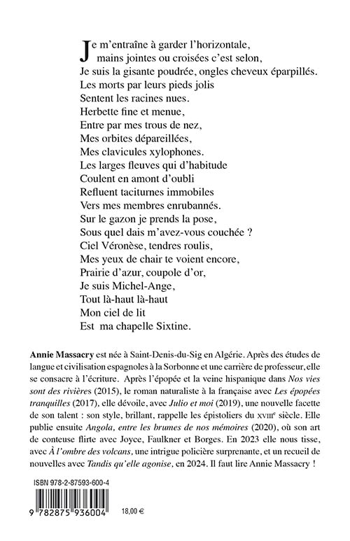 Annie Massacry est née à Saint-Denis-du-Sig en Algérie. Après des études de langue et civilisation espagnoles à la Sorbonne et une carrière de professeur, elle se consacre à l’écriture. Après l’épopée et la veine hispanique dans Nos vies sont des rivières (2015), le roman naturaliste à la française avec Les épopées tranquilles (2017), elle dévoile, avec Julio et moi (2019), une nouvelle facette de son talent : son style, brillant, rappelle les épistoliers du XVIIIe siècle. Elle publie ensuite Angola, entre les brumes de nos mémoires (2020), où son art de conteuse flirte avec Joyce, Faulkner et Borges. En 2023 elle nous tisse, avec À l’ombre des volcans, une intrigue policière surprenante, et un recueil de nouvelles avec Tandis qu’elle agonise, en 2024. Il faut lire Annie Massacry !