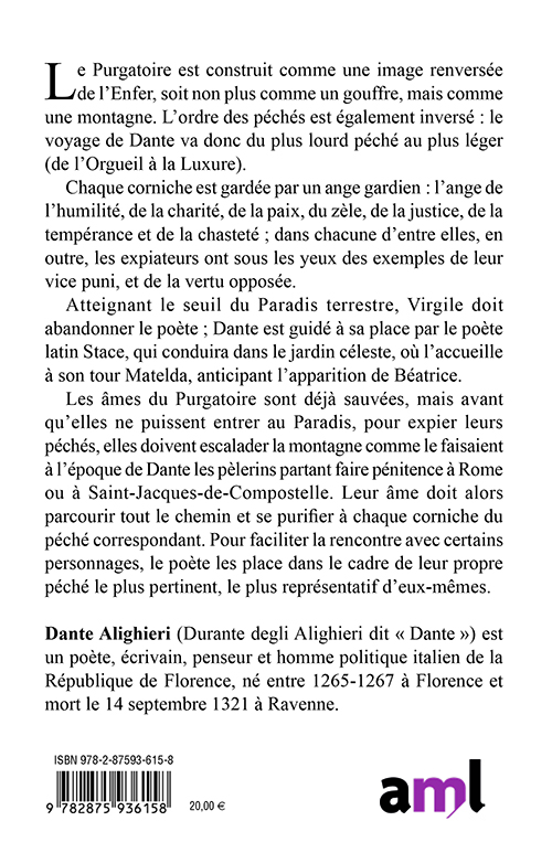 Les âmes du Purgatoire sont déjà sauvées, mais avant qu’elles ne puissent entrer au Paradis, pour expier leurs péchés, elles doivent escalader la montagne comme le faisaient à l’époque de Dante les pèlerins partant faire pénitence à Rome ou à Saint-Jacques-de-Compostelle. Leur âme doit alors parcourir tout le chemin et se purifier à chaque corniche du péché correspondant. Pour faciliter la rencontre avec certains personnages, le poète les place dans le cadre de leur propre péché le plus pertinent, le plus représentatif d’eux-mêmes.