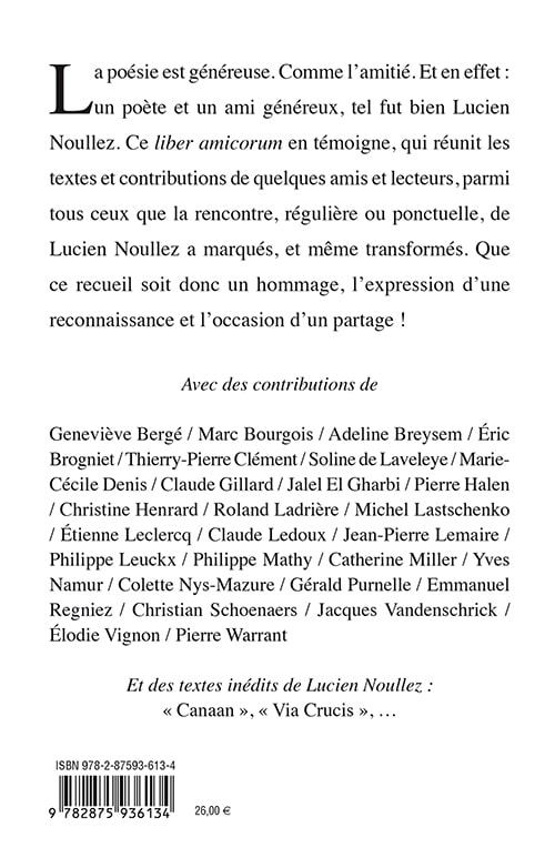 La poésie est généreuse. Comme l’amitié. Et en effet : un poète et un ami généreux, tel fut bien Lucien Noullez. Ce liber amicorum en témoigne, qui réunit les textes et contributions de quelques amis et lecteurs, parmi tous ceux que la rencontre, régulière ou ponctuelle, de Lucien Noullez a marqués, et même transformés. Que ce recueil soit donc un hommage, l’expression d’une reconnaissance et l’occasion d’un partage !