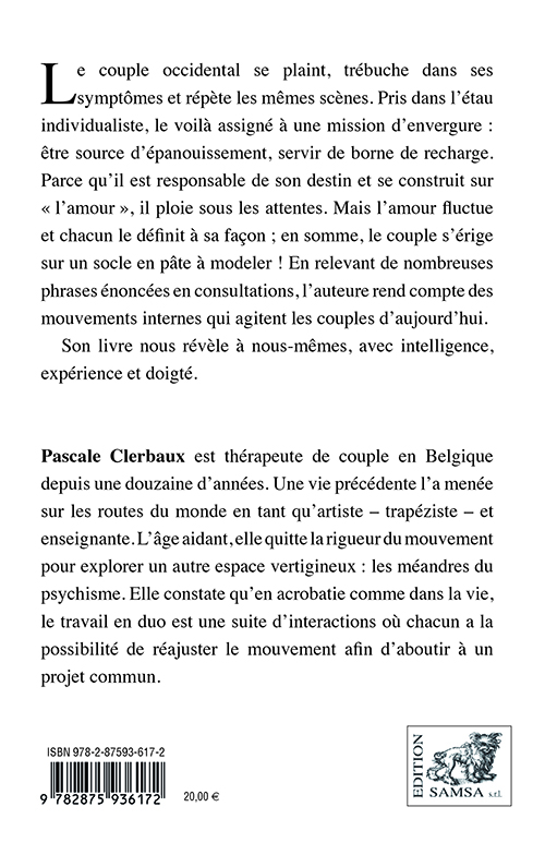 Pascale Clerbaux est thérapeute de couple en Belgique depuis une douzaine d’années. Une vie précédente l’a menée sur les routes du monde en tant qu’artiste – trapéziste – et enseignante. L’âge aidant, elle quitte la rigueur du mouvement pour explorer un autre espace vertigineux?: les méandres du psychisme. Elle constate qu’en acrobatie comme dans la vie, le travail en duo est une suite d’interactions où chacun a la possibilité de réajuster le mouvement afin d’aboutir à un projet commun.